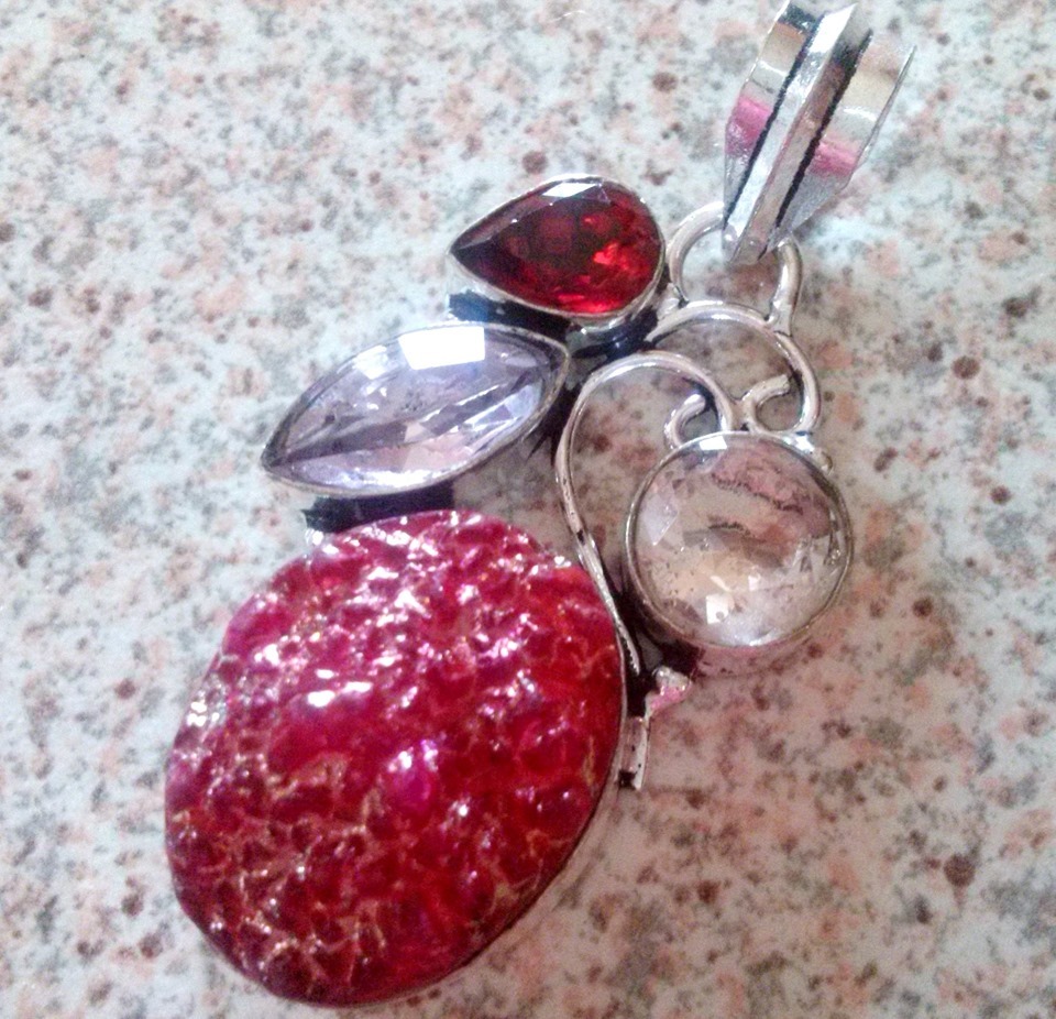 Ινδικό χειροποίητο μενταγιόν στα 5cm κατασκευασμένο εξολοκλήρου από ασήμι 925 διακοσμημένο με ένα μεγάλο κόκκινο κοράλλι, δύο λευκά ζαφείρια και ένα κόκκινο ζαφείρι!