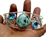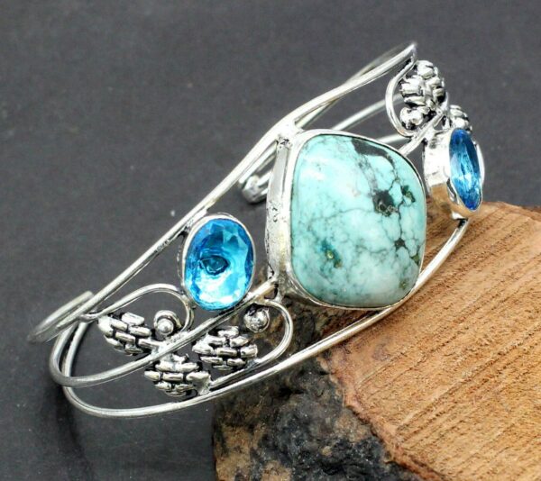 Χειροποίητο, ινδικό βραχιόλι, κατασκευασμένο από ασήμι 925, διακοσμημένο με πολύτιμους λίθους. Ορυκτό τυρκουάζ και δύο μπλε τοπάζ σε κοπή οβάλ . Total Carat Weight (TCW): 120 CTS. Οpen Size για να προσαρμόζεται σε όλους τους καρπούς.