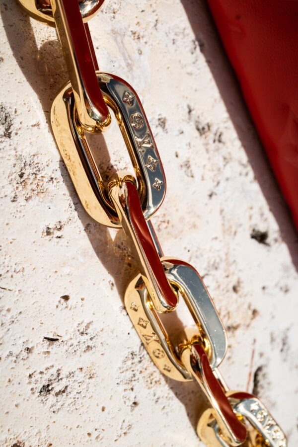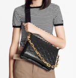 Η πιο εντυπωσιακή τσάντα της συλλογής Άνοιξη-Καλοκαίρι 2021, η τσάντα Coussin MM είναι φτιαγμένη από φουσκωμένο δέρμα, με ανάγλυφο σχέδιο Monogram. Ογκώδης, απαλή και ελαστική, η τσάντα μοιάζει σχεδόν σαν μαξιλάρι. Ένας ρυθμιζόμενος ιμάντας επιτρέπει τη μεταφορά στους ώμους και χιαστί, ενώ η νέα αλυσίδα Edge επιτρέπει τη μεταφορά κάτω από το χέρι και τη μπαγκέτα. Διαθέτει αφαιρούμενο ιμάντα σε μαύρο χρώμα.