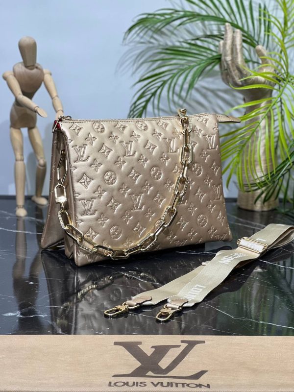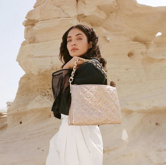 Η πιο εντυπωσιακή τσάντα της συλλογής Άνοιξη-Καλοκαίρι 2021, η τσάντα Coussin MM είναι φτιαγμένη από φουσκωμένο δέρμα, με ανάγλυφο σχέδιο Monogram. Ογκώδης, απαλή και ελαστική, η τσάντα μοιάζει σχεδόν σαν μαξιλάρι. Ένας ρυθμιζόμενος δερμάτινος ιμάντας επιτρέπει τη μεταφορά στους ώμους και χιαστί, ενώ η νέα αλυσίδα Edge επιτρέπει τη μεταφορά κάτω από το χέρι και τη μπαγκέτα. Διαθέτει αφαιρούμενο ιμάντα σε gold χρώμα.