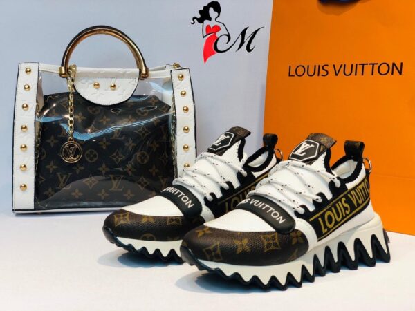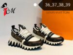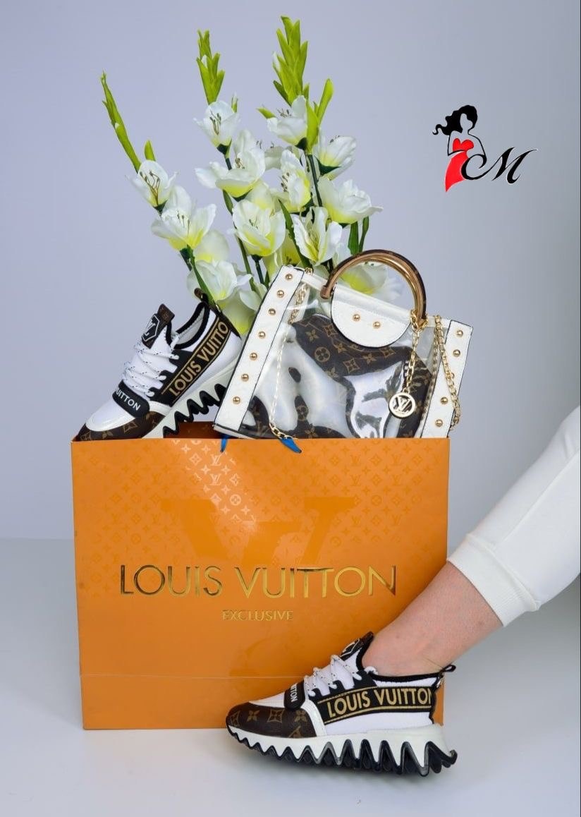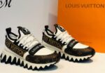 Υπέροχα γυναικεία παπούτσια Louis Vuitton σε λευκό χρώμα με καφέ και χρυσές λεπτομέρειες, ελαφριά και εξαιρετικά αναπαυτικά. Διαθέτουν αντιολισθητική σόλα. Τα παπούτσια διαθέτουν λευκά κορδόνια, χρυσές λεπτομέρειες υλικού και σόλες από καουτσούκ.. Εκθεσιακά κομμάτια βιτρίνας καταστήματος προηγούμενης σεζόν.