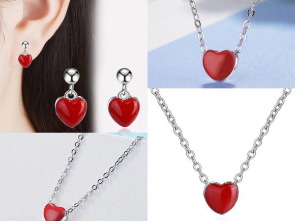 Υπέροχο σετ κοσμημάτων που αποτελείται από μενταγιόν, βραχιόλι και σκουλαρίκια. Κατασκευασμένα από ασήμι 925 και διακοσμημένα με μία κατακόκκινη καρδιά (μέγεθος μοτίφ: 8MMx8MM).