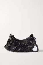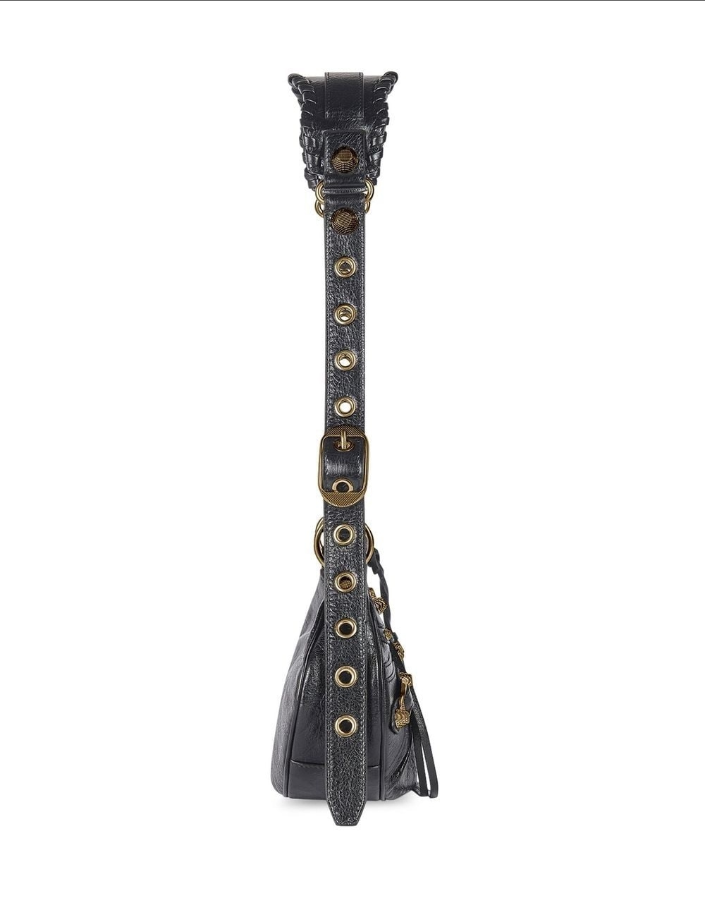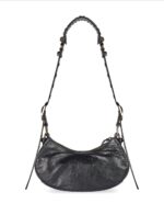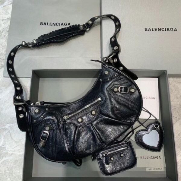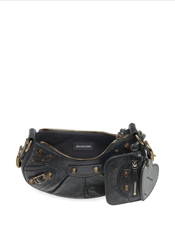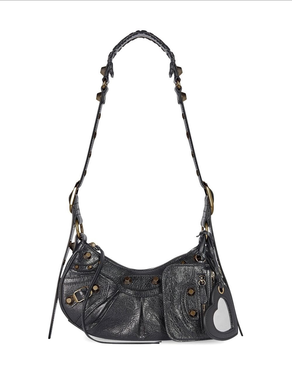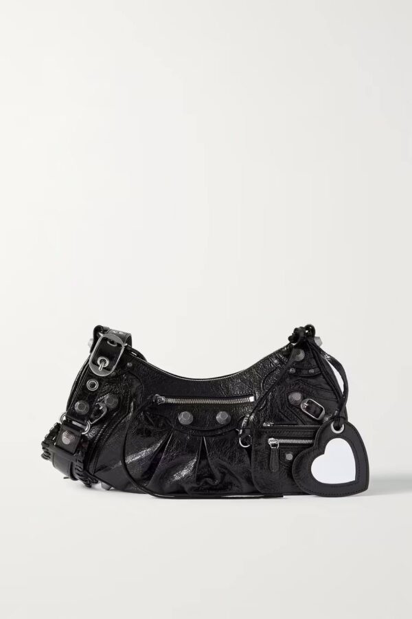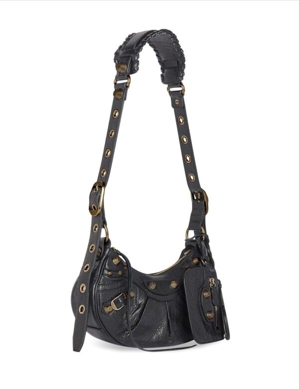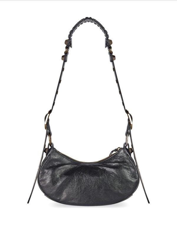 Εμπνευσμένη από τα κλασικά στυλ της δεκαετίας του 2000, η τσάντα «Le Cagole» της Balenciaga έχει μικρό, αδύνατο σχήμα και ρυθμιζόμενο λουράκι που κάθεται άνετα χιαστί ή στον ώμο σας. Είναι κατασκευασμένη από μαύρο τσαλακωμένο ανάγλυφο δέρμα και διακοσμημένη με μεταλλικά καρφιά. Μοντέρνα και άκρως νεανική θα σας ενθουσιάσει και θα αναδείξει το στυλ σας!!