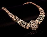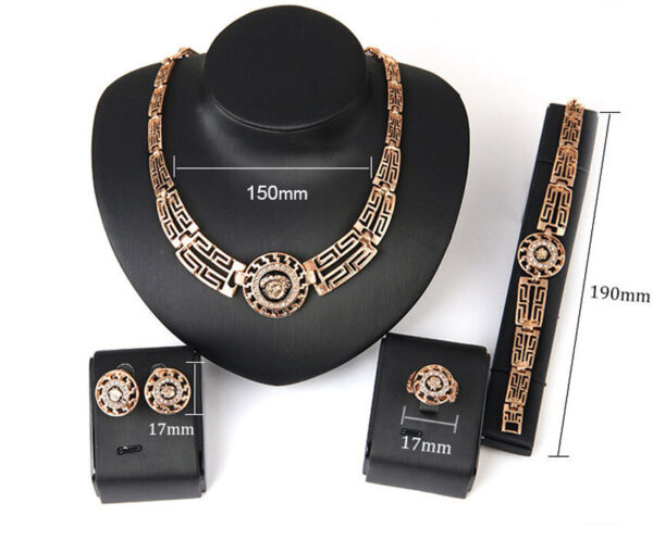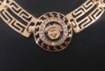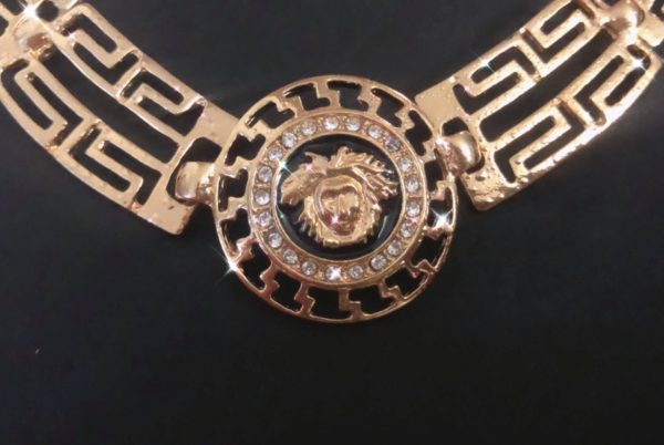 Πολυτελείας γυναικείο σετ κοσμημάτων “Mέδουσα” πιστό αντίγραφο του οίκου VERSACE! Αποτελείται από μενταγιόν (46,5cm), βραχιόλι (19cm), σκουλαρίκια (17cm) και δαχτυλίδι. Κατασκευασμένο από ασήμι και χαλκό με επιμετάλλωση κίτρινου χρυσού. Διακοσμημένο με λευκά ζιργκόν σε κοπή round.