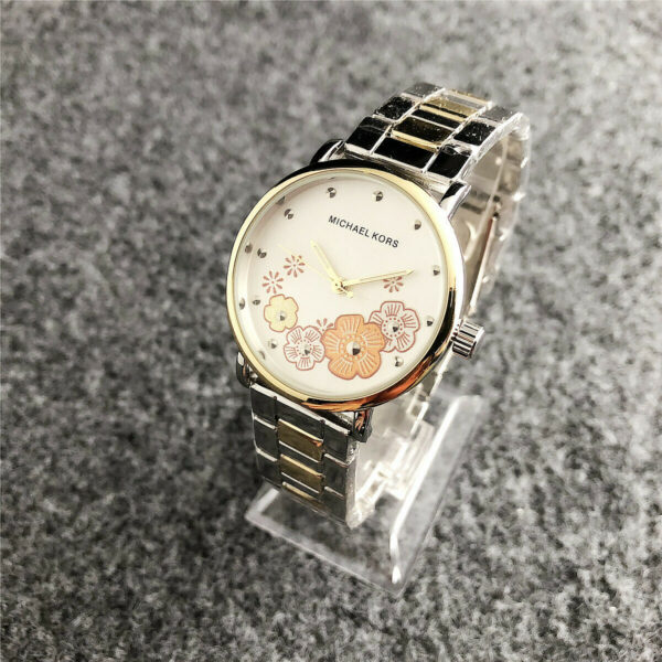 Μοναδικής ομορφιάς αναλογικό ρολόι πολυτελείας Michael Kors σε silver-gold χρώμα! Η κάσα του διακοσμείται εσωτερικά με πολύχρωμες μαργαρίτες καθώς και με αυστραλιανά κρύσταλλα που προσδίδουν ξεχωριστή ομορφιά και φινέτσα στο ρολόι!  Διάσταση καντράν 3,8 εκατοστά! Η κάσα του και το μπρασελέ του είναι από ανοξείδωτο ατσάλι!