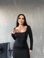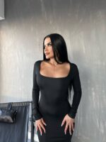 Το μακρύ εφαρμοστό φόρεμα σε μαύρο χρώμα αποπνέει μια αύρα αέρινης κομψότητας και αισθησιασμού. Τα μακριά μανίκια προσφέρουν μια νότα μυστηρίου και ρομαντισμού.