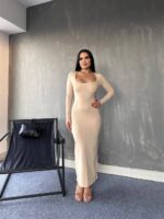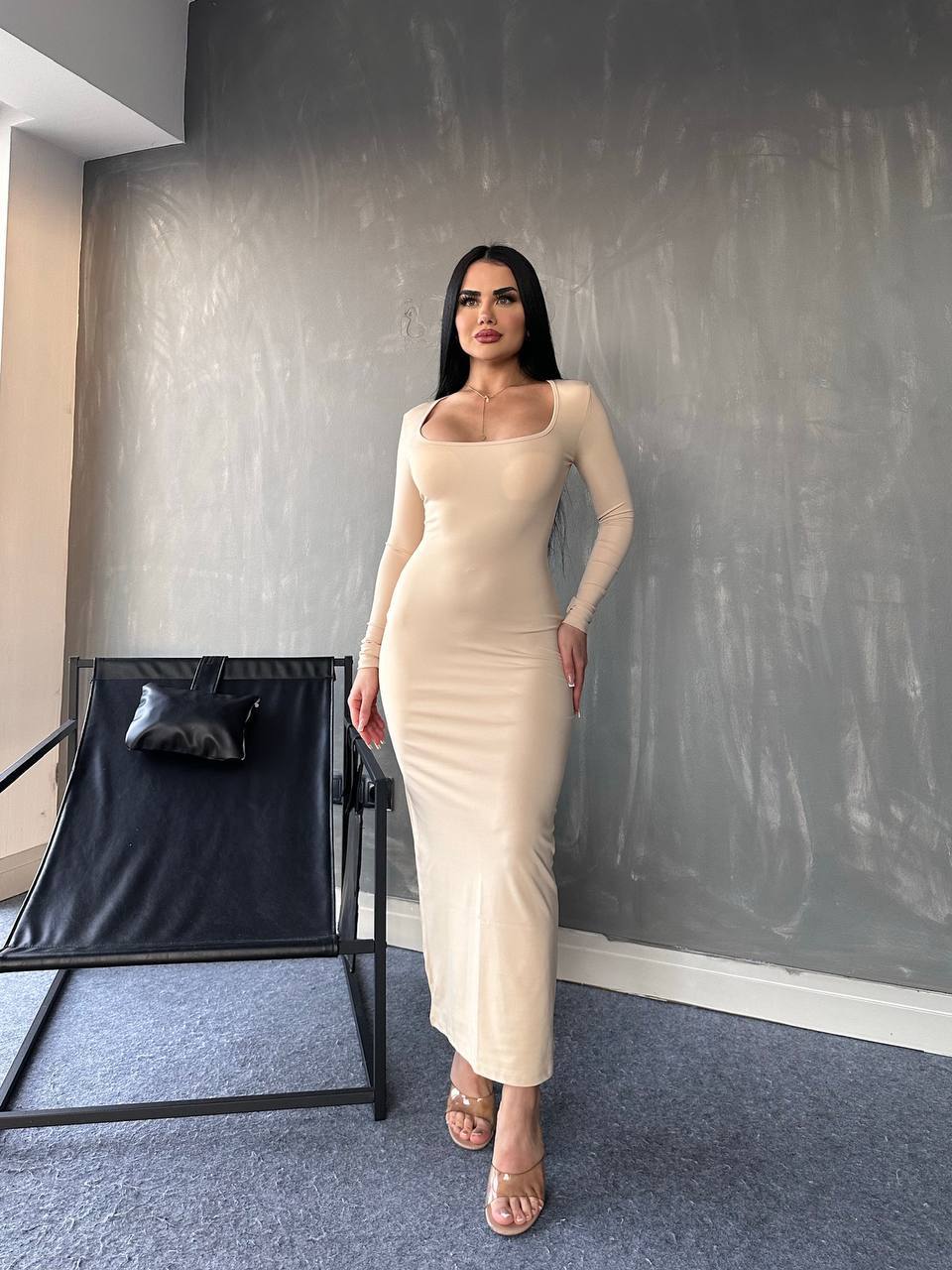 Το μακρύ εφαρμοστό φόρεμα σε Neutral γήινο χρώμα αποπνέει μια αύρα αέρινης κομψότητας και αισθησιασμού. Τα μακριά μανίκια προσφέρουν μια νότα μυστηρίου και ρομαντισμού.