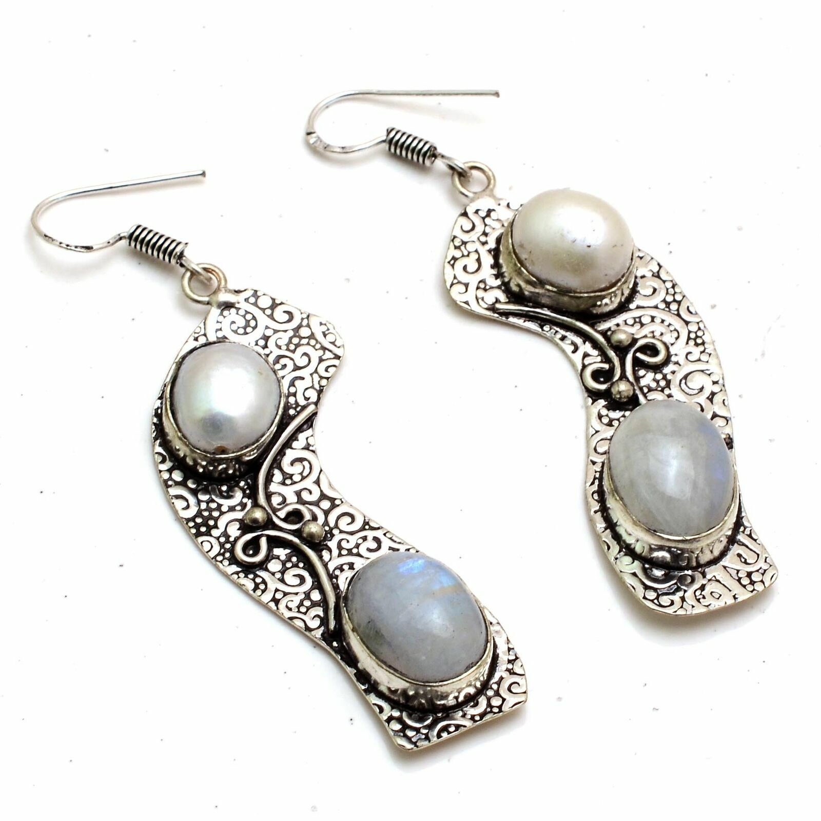 Σκουλαρίκια ινδικά χειροποίητα κατασκευασμένα από μασίφ ασήμι 925 και διακοσμημένα με υπέροχες πολύτιμες moonstone (φεγγαρόπετρες) και δύο καταπληκτικά μαργαριτάρια 100% φυσικά γλυκού νερού. Τα σκουλαρίκια έχουν μήκος 4,8 εκατοστά
