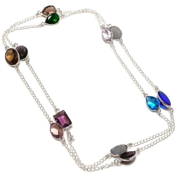 Μακρύ εντυπωσιακό, χειροποίητο κολιέ, ασημένιο 925, μήκους 92 εκατοστών. Διακοσμημένο με τον πλούτο της γης, με πολύτιμους και ημιπολύτιμους λίθους.  Υπέροχες, λαμπερές πέτρες  Διόπιδα, Αχάτη, Αμέθυστου, μπλε & λευκό Τοπάζι, Χαλαζίας Καπνίας. Οι ημιπολύτιμοι λίθοι είναι ένα από τα πιο όμορφα δώρα της γης στον άνθρωπο.