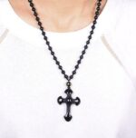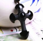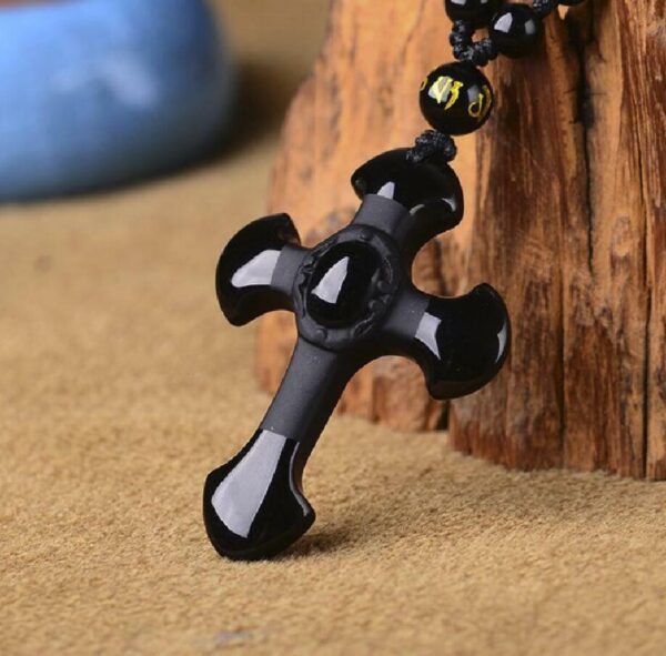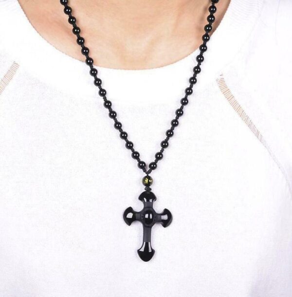 Ένας πραγματικά καταπληκτικός ανδρικός σταυρός, κατασκευασμένος από ορυκτό, φυσικό οψιδιανό, σκουρόχρωμο με υαλώδη υφή (θεωρείται φυσικό γυαλί) σε μαύρο χρώμα, μήκος αλυσίδας 56 εκατοστά. Διαστάσεις 5,2 χ 33 εκατοστά.