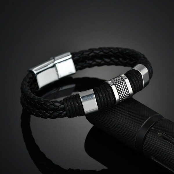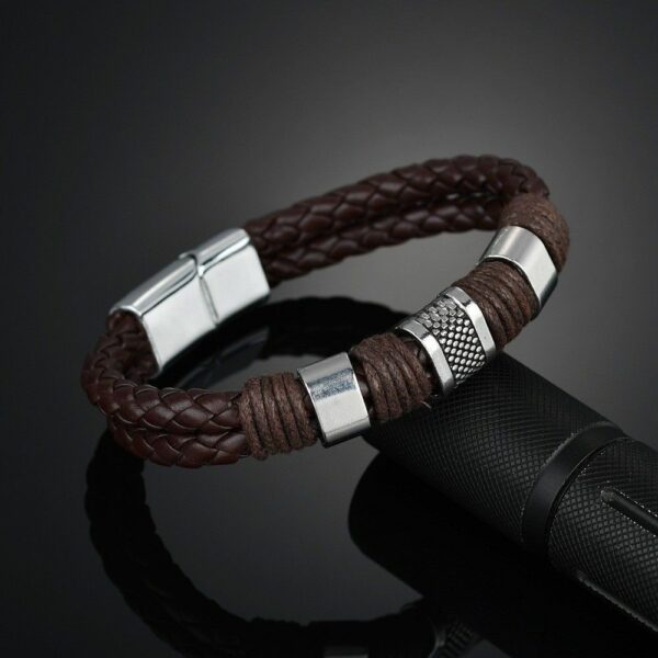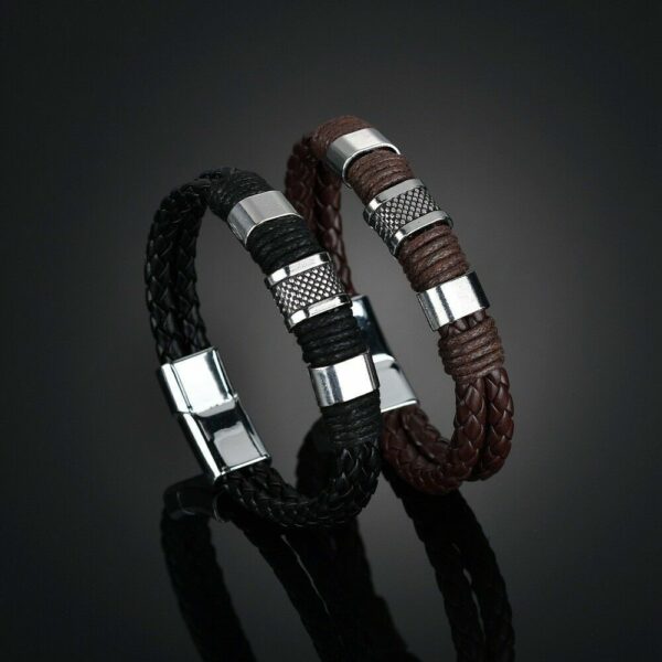 Ανδρικό βραχιόλι σε καφέ ή μαύρη απόχρωση με ιδιαίτερη πλέξη και μαγνητικό κούμπωμα, με Silver λεπτομέρειες από ατσάλι. Περίμετρος βραχιολιού 21 cm.