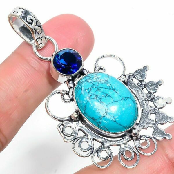 Χειροποίητο, ινδικό μενταγιόν, πραγματικό έργο τέχνης. Κατασκευασμένο από ασήμι 925 και διακοσμημένο με ορυκτή πέτρα, Santa Rosa Turquoise, σε κοπή oval και ένα μικρότερο μπλε ζαφείρι σε κοπή round με ιδιαίτερο χειροποίητο σκάλισμα. Μήκος 6 εκατοστά.