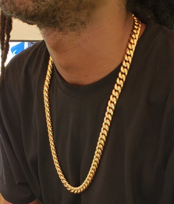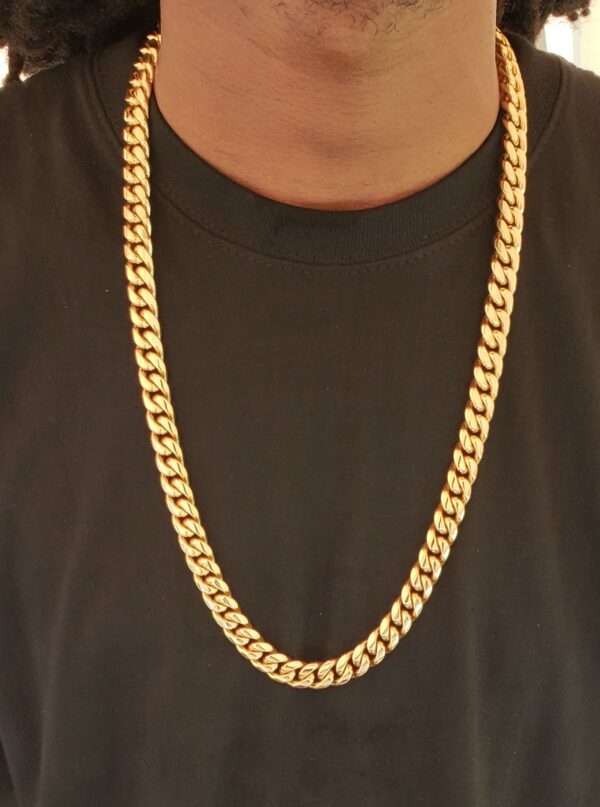 Η πλούσια επιχρυσωμένη αλυσίδα 14 καρατίων είναι κατασκευασμένη από συμπαγή ανοξείδωτο χάλυβα. Προσφέροντας μια πιο στρογγυλή και παχύτερη αλυσίδα, το στυλ αλυσίδας Miami Cuban. Φαρδιά Πάχους 8 mm και μήκος 60 cm.