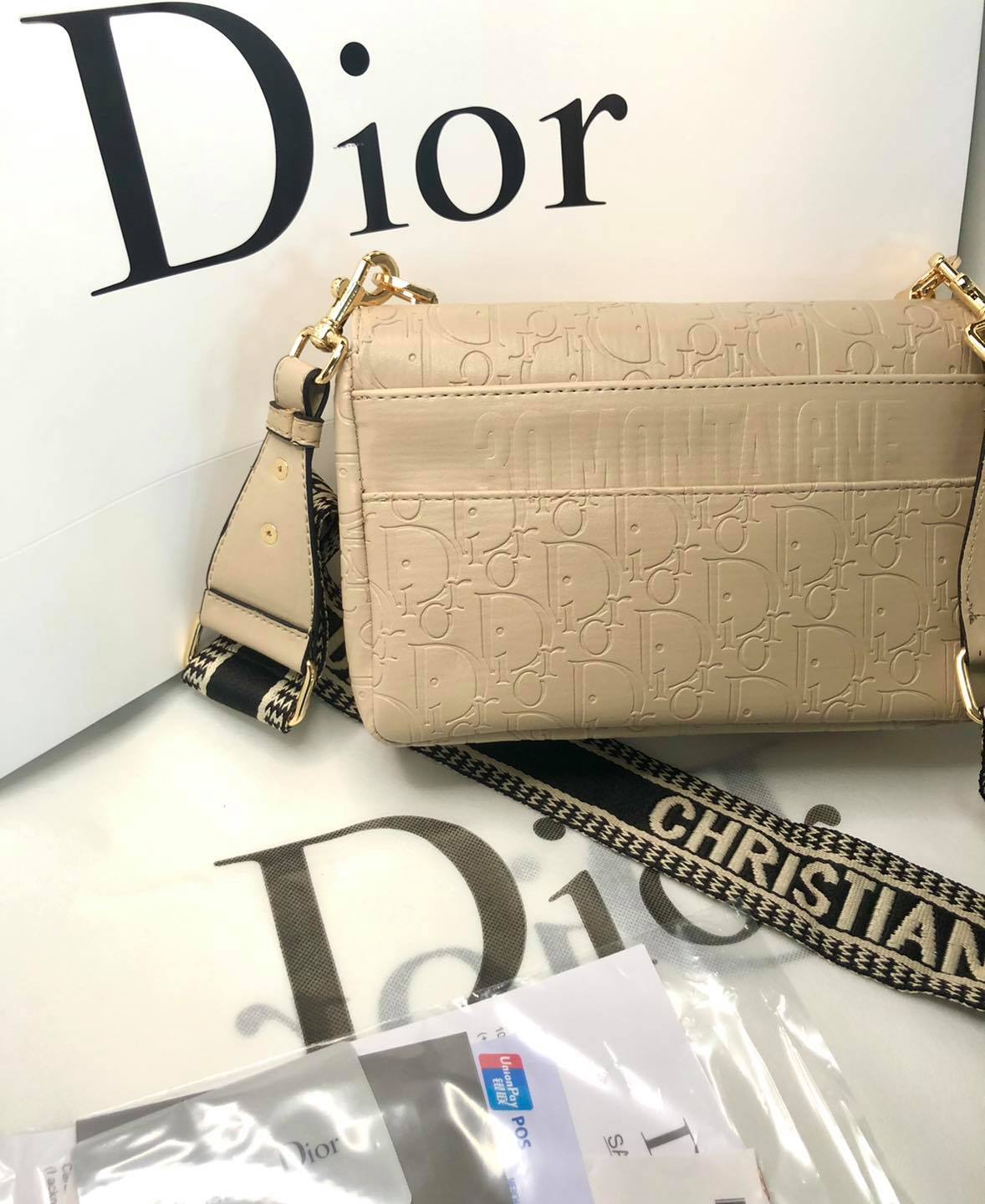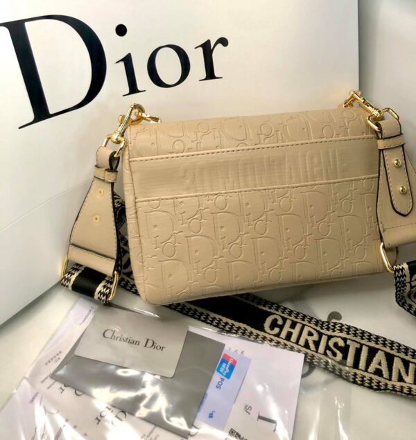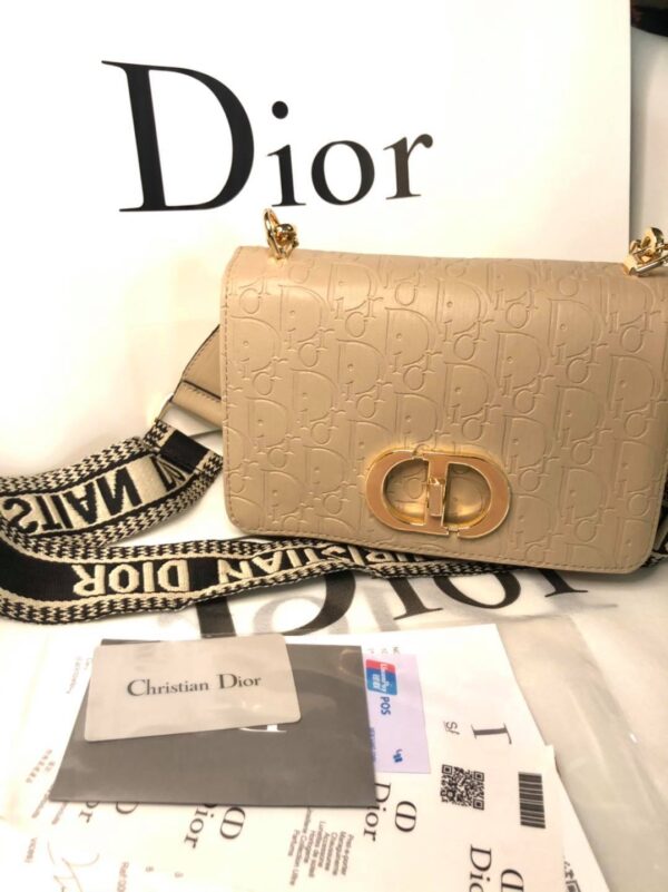 Αυτή η τσάντα είναι κατασκευασμένη σε μπεζ δέρμα αποτυπωμένο με υφή Microcannage για κομψή και διαχρονική εμφάνιση. Διακοσμημένη με μεταλλικό κούμπωμα από «χρυσό» φινίρισμα, εμπνευσμένο από τη σφραγίδα μιας φιάλης Christian Dior. Οι εκλεπτυσμένες λεπτομέρειες, όπως μια ανάγλυφη υπογραφή «30 Montaigne» στο πίσω μέρος, τονίζουν το κομψό σχέδιο.