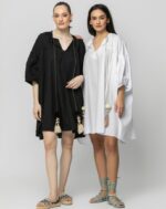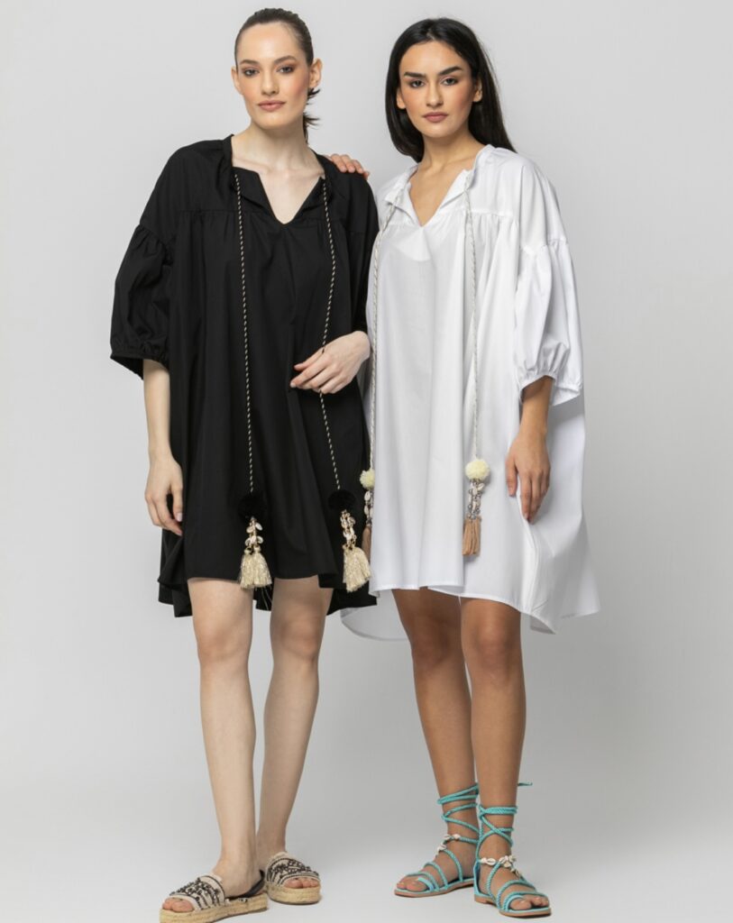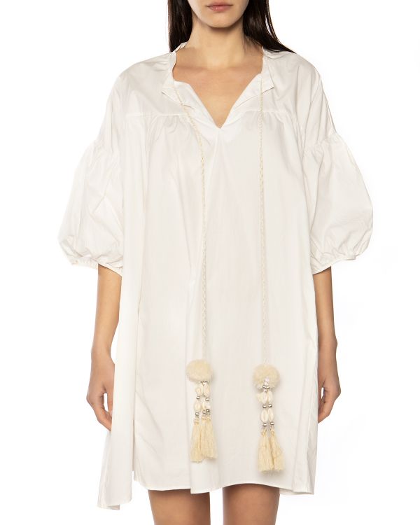 Midi φόρεμα oversized με v λαιμόκοψη και κορδόνια με φουντάκια διακοσμημένα με φυσικά κοχύλια