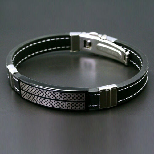 Mοντέρνα ανδρική χειροπέδα κατασκευασμένη από ανοξείδωτο ατσάλι και καουτσούκ, έτσι ώστε να μένει αμετάβλητη στο χρόνο και να τη φοράτε όλες τις ώρες της ημέρας. Διαστάσεις 21,5 cm.