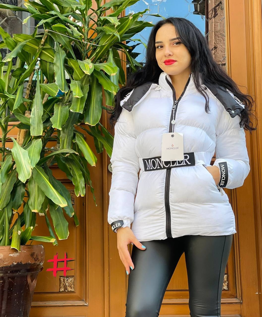 - Moncler λευκό μπουφάν με κανονική γραμμή, μακριά μανίκια και κουκούλα