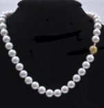 Κολιέ από λευκές στρογγυλές μεγάλες πέρλες 12mm South Sea Shell. Δεμένες στο χέρι με κόμπους μεταξύ τους σε διπλό μεταξωτό νήμα. Επίχρυσο κούμπωμα 14 καράτια διακοσμημένο με λευκά ζαφείρια (Lab creation) σε κοπή round. Μήκους 55- 60 εκατοστών. Ένα διαχρονικό κόσμημα για κάθε περίσταση που θα απογειώσει την εμφάνισή σας.