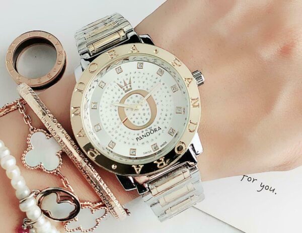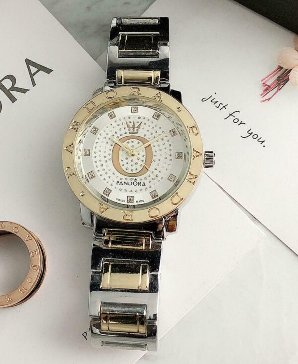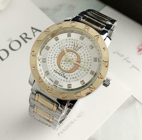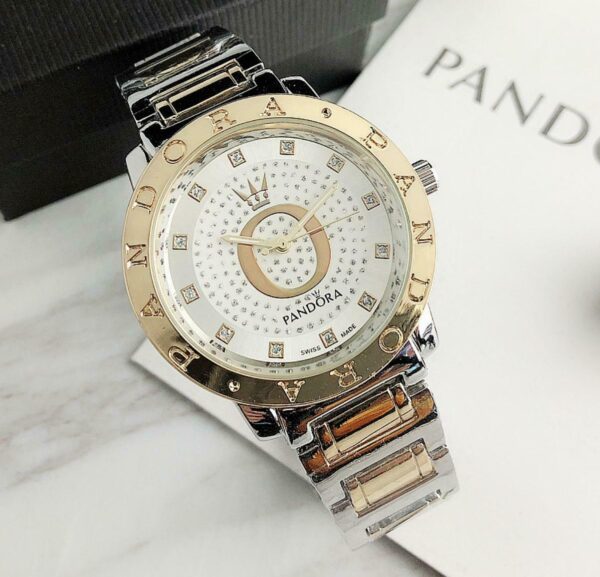 Γυναικείο ρολόι πολυτελείας PANDORA, αναλογικό, πολύ μοντέρνο, σε silver – gold χρώμα σε μπρασελέ και καντράν από ανοξείδωτο ατσάλι υψηλής αντοχής και ποιότητας για καθημερινή χρήση και με ενισχυμένο αντιθαμβωτικό τζάμι στο καντράν του! Αντιαλλεργικό, σύμφωνα με τις απαιτήσεις της Ευρωπαϊκής Ένωσης! Διακοσμημένο εσωτερικά με λευκά αυστραλιανά κρύσταλλα!