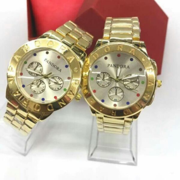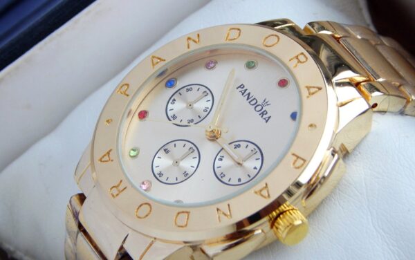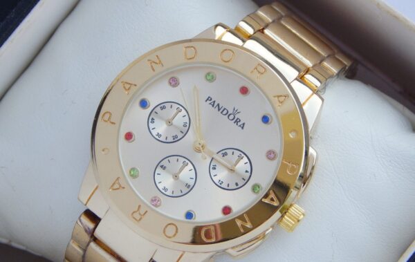 Γυναικείο ρολόι PANDORA πολυτελείας με gold μπρασελέ και καντράν! Η κάσα του είναι κατασκευασμένη από ανοξείδωτο ατσάλι και είναι αδιάβροχο μέχρι 3 Atm (πλύσιμο χεριών). Διακοσμημένο εσωτερικά με χρυσή πλάκα και με πολύχρωμα αυστραλιανά κρύσταλλα εξαιρετικής ποιότητας. Διάμετρος καντράν 4,2 εκατοστά!!