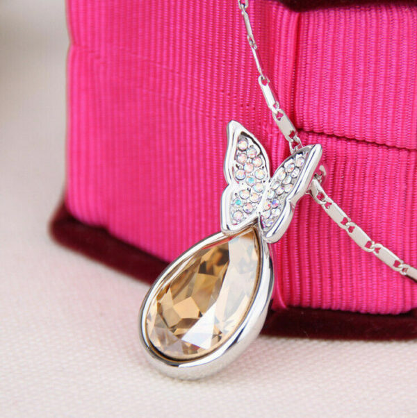 Μενταγιόν το δάκρυ της πεταλούδας, διακοσμημένη με λευκά ζιργκόν και κρύσταλλα στο χρώμα του ήλιου, υπέροχος σχεδιασμός αλυσίδας με μάκρος ως τη βάση του λαιμού.