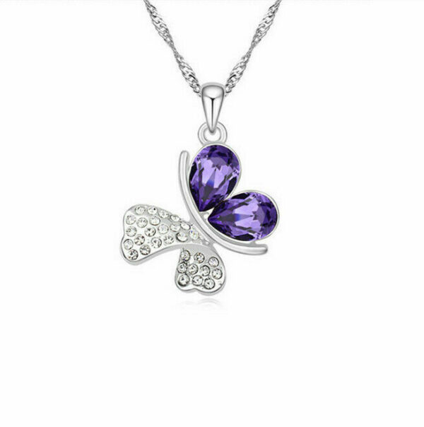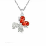 Μενταγιόν με μοτίφ μία πεταλούδα, διακοσμημένη με κόκκινα κρύσταλλα σε κοπή pears και λευκά κρύσταλλα σε κοπή round, κατασκευασμένη από German Silver. Συνοδεύεται από αλυσίδα μήκους 45 εκατοστών συν 5 εκατοστά το αλυσιδάκι προέκτασης.