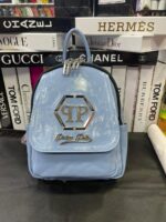 Philipp plein backpack με ρυθμιζόμενους ιμάντες, σε υπέροχο χρώμα σιέλ λουστρέ. Φοδραρισμένο εσωτερικά με μαύρη φόδρα με το λογότυπο philipp plein. Εσωτερικό τσεπάκι με φερμουάρ, πλαϊνές θήκες και άλλη μία μικρότερη εξωτερική θήκη που κλείνει επίσης με φερμουάρ.