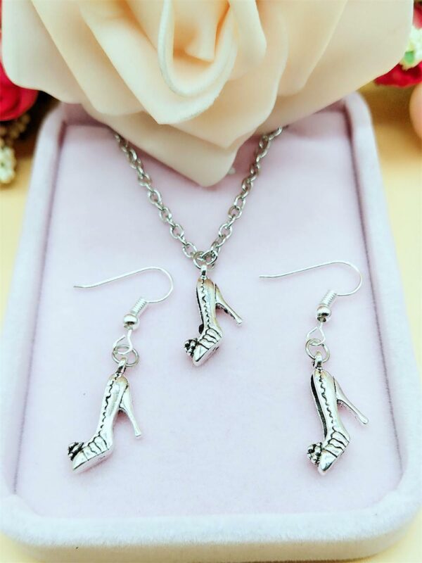 Παιχνιδιάρικο και νεανικό σετ που αποτελείται από μενταγιόν και σκουλαρίκια, με μοτίφ δύο ψηλοτάκουνες γυναικείες γόβες μικρές και πολύ διακριτικές!