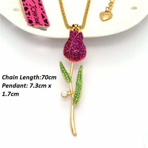Πραγματικό έργο τέχνης η καρφίτσα που σας προτείνουμε με μοτίφ μία τουλίπα, διακοσμημένη με πράσινα και κόκκινα αυστραλιανά κρύσταλλα και μία λευκή round πέρλα. Η καρφίτσα μπορεί να μεταμορφωθεί και σε ένα πολύ όμορφο μενταγιόν αφού συνοδεύεται από αλυσίδα 70 εκατοστών μήκους και 3 χιλιοστών πάχους, κατασκευασμένη από ασήμι και χαλκό. Επιμετάλλωση κίτρινου χρυσού. Η καρφίτσα – μενταγιόν είναι σχεδιασμένη από την Βetsey Johnson