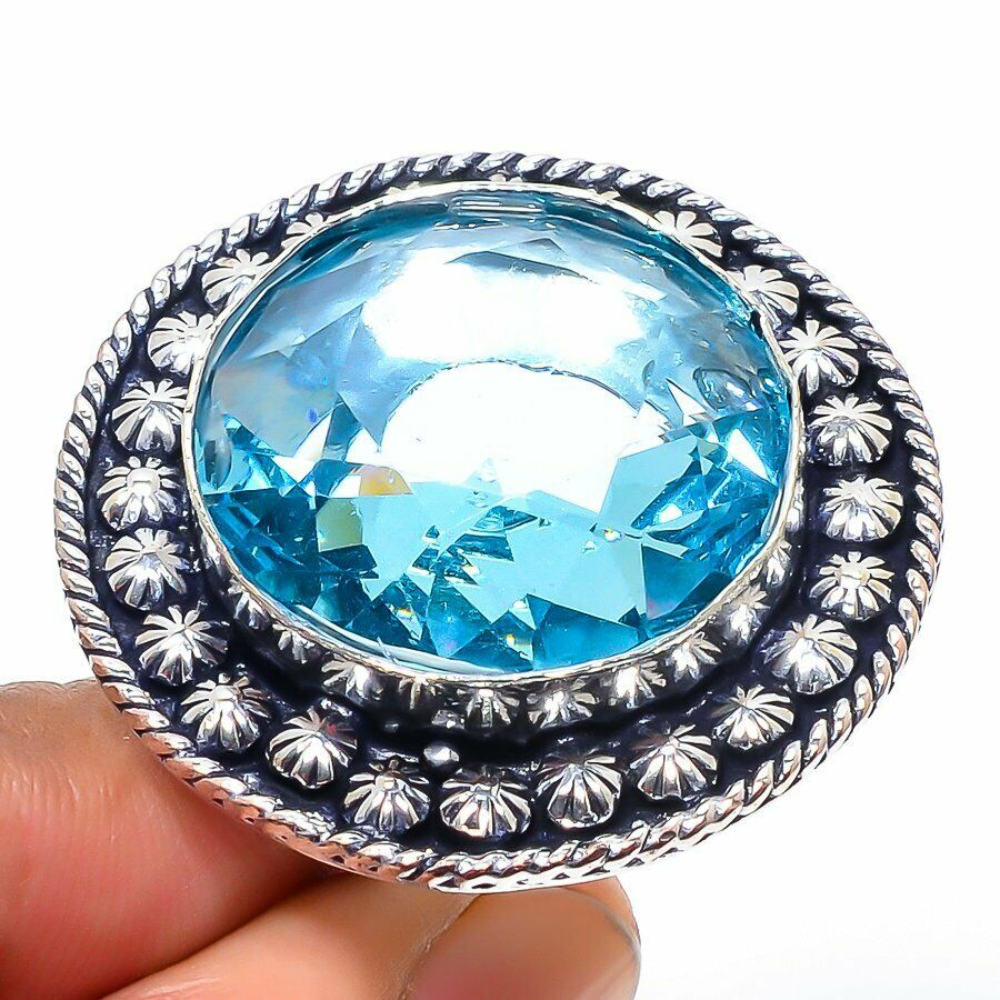 Χειροποίητο δαχτυλίδι  κατασκευασμένο από ασήμι 925, διακοσμημένο με πέτρα Swiss Blue Topaz, (Lab creation) σε κοπή round. Διαμέτρου 3,7 εκατοστών.