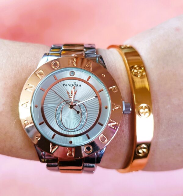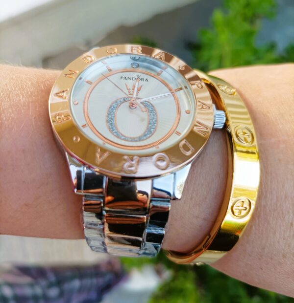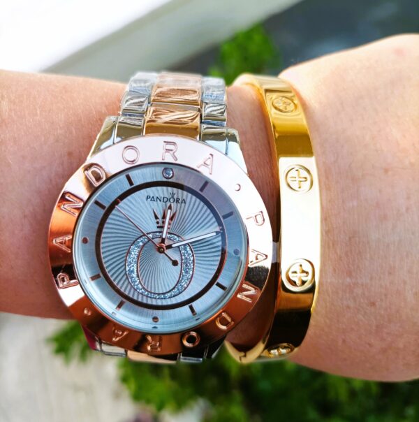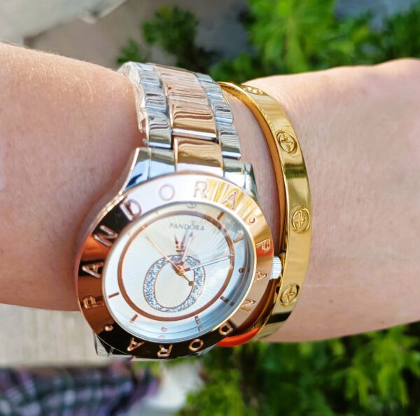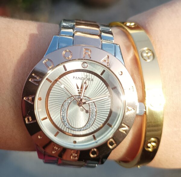 Γυναικείο ρολόι PANDORA πολυτελείας με δίχρωμο μπρασελέ και καντράν! Διάμετρος καντράν 4,2 εκατοστά!! Κατασκευασμένο εξ ολοκλήρου από ανοξείδωτο ατσάλι, είναι αδιάβροχο μέχρι 3 Atm (πλύσιμο χεριών). Διάμετρος καντράν 4,2 εκατοστά με ορυκτό κρύσταλλο!! Συνοδεύεται από το αγαπημένο σας “love” βραχιόλι σε χρυσό χρώμα κατασκευασμένο από ανοξείδωτο ατσάλι, με διπλή επιμετάλλωση κίτρινου χρυσού.
