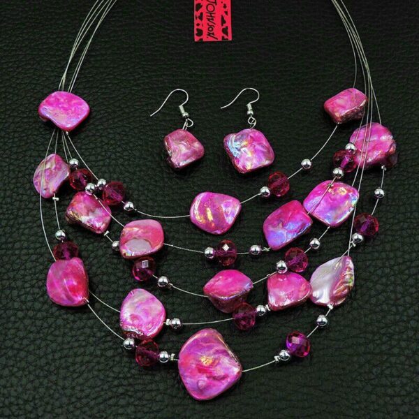 Σετ, στο χρώμα του φούξια, που αποτελείται από κολιέ 5 σειρών και σκουλαρίκια με επιμετάλλωση από ασήμι, φιλοτεχνημένο από τη γνωστή σχεδιάστρια κοσμημάτων Βetsey Johnson, ορυκτές ακατέργαστες, πέτρες με γυαλιστερό φινίρισμα και κρύσταλλα!