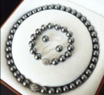 Σετ που αποτελείται από κολιέ με genuine natura south sea Shell πέρλες ΑΑΑ+, μέγεθος 10mm,περασμένες μία-μία χωριστά σε διπλό μεταξωτό νήμα, μήκος κολιέ 48 εκατοστά, σε χρώμα γκρι σκούρο, με τα ακριβώς ίδια σκουλαρίκια του!! Τα μεταλλικά στοιχεία του είναι από ασήμι 925 με επιμετάλλωση λευκού χρυσού.