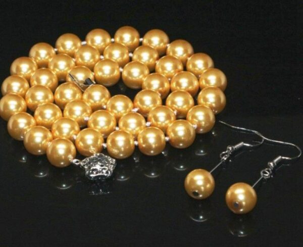 Σετ που αποτελείται από κολιέ με South Sea Shell Round πέρλες ΑΑΑ μέγεθος 8mm, δεμένες μία-μία χωριστά σε διπλό μεταξωτό νήμα , μήκος 47 εκατοστά σε χρώμα χρυσό, με τα ακριβώς ίδια σκουλαρίκια του!! Τα μεταλλικά στοιχεία του είναι από ασήμι 925.