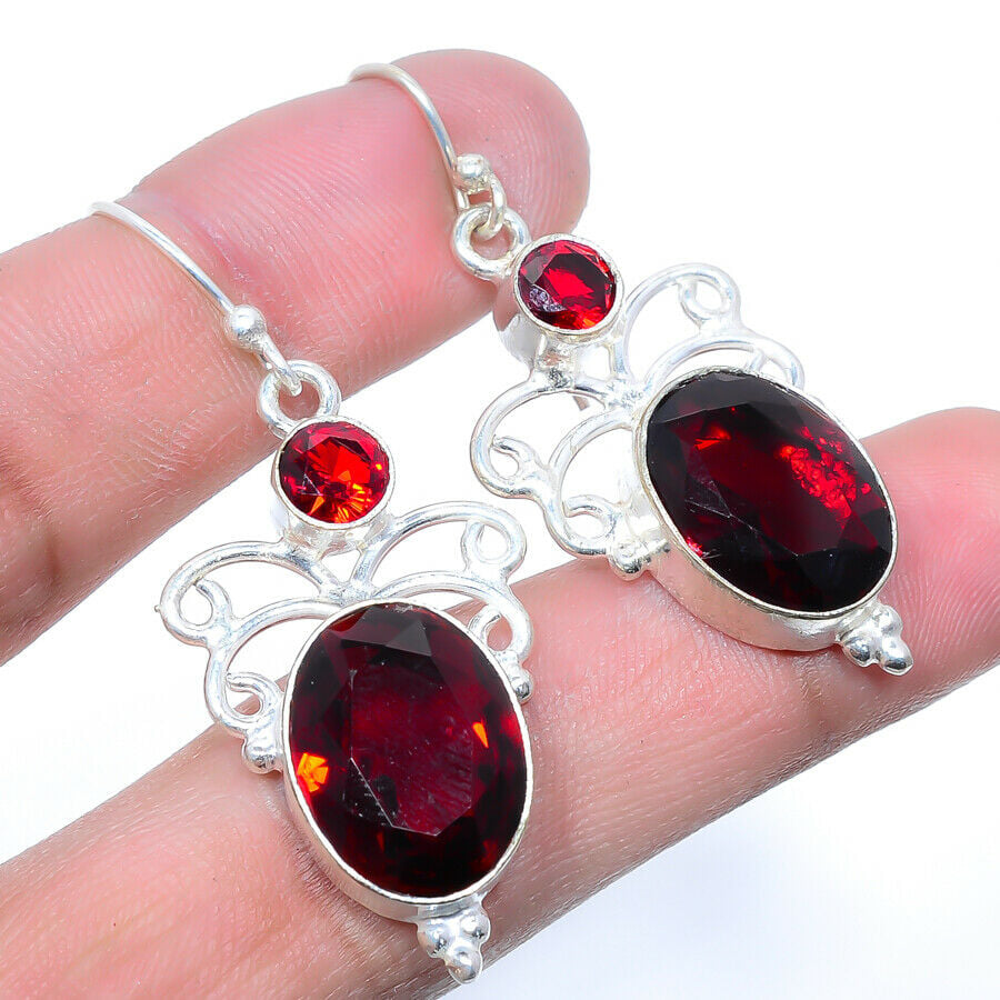 Χειροποίητα σκουλαρίκια, κατασκευασμένα από ασήμι 925 και διακοσμημένα με Γρανάτη Μοζαμβίκης (Mozambique Garnet) Lab-Created. Total Carat Weight (TCW): 20. Τα σκουλαρίκια έχουν μήκος 3,7 εκατοστά. Σε κοπή oval.