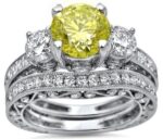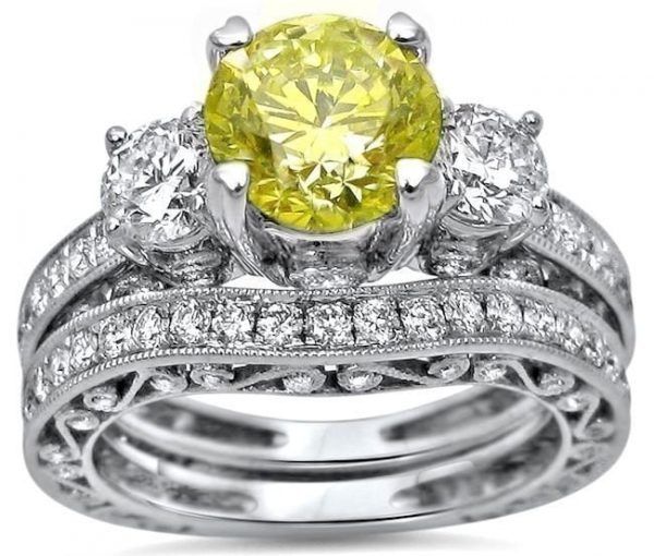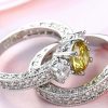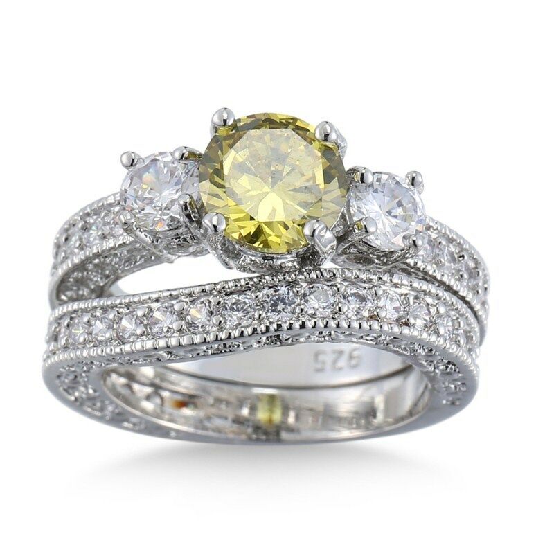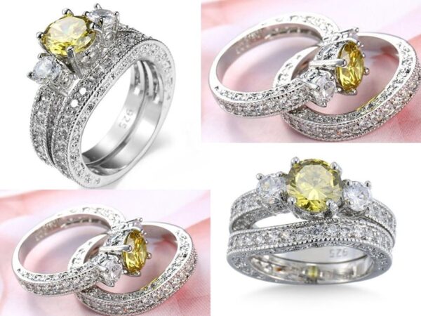 Επάργυρο 925 σετ δαχτυλιδιών, που αποτελείται από βέρα διακοσμημένη ολόκληρη με λευκά ζαφείρια (lab-created) σε κοπή round και μονόπετρο δαχτυλίδι διακοσμημένο με κίτρινο ζαφείρι 7χ7 mm (lab-created) σε κοπή round. Βάρος Πετρών :0.48ct – 0.10ct.Βάρος 4,6grams