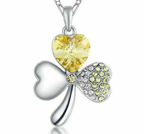 Επάργυρο μενταγιόν με μοτίφ ένα τριφύλλι διακοσμημένο με κίτρινα κρύσταλλα απίστευτης λάμψεις, μήκος αλυσίδας 45 εκατοστά + 7 εκατοστά το αλυσιδάκι προέκτασης.