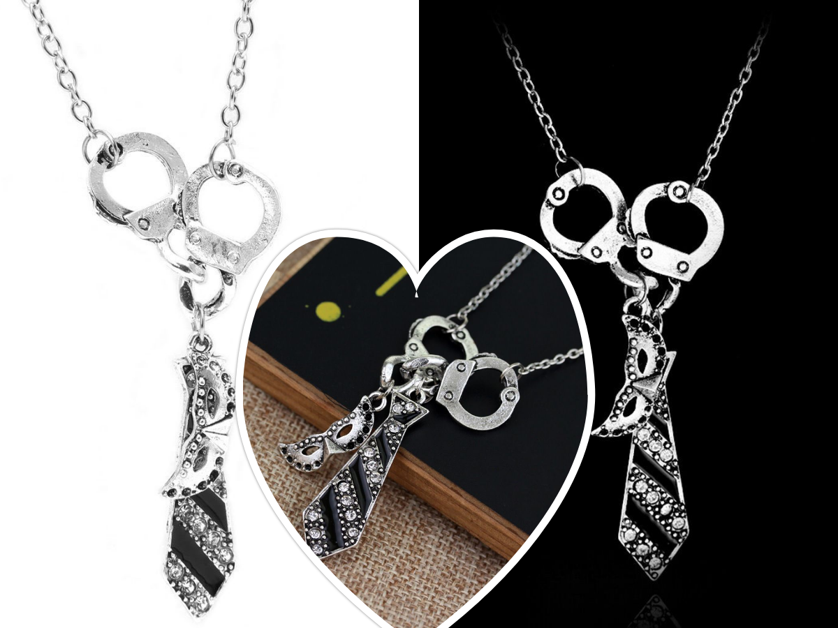 Ιδιαίτερο, γυναικείο μενταγιόν, εμπνευσμένο από την ταινία “Oι 50 αποχρώσεις του Γκρι”, με μοτίφ μία γραβάτα, χειροπέδες και μία μάσκα! Κατασκευασμένο ατσάλι, λεπτομέρειες από μαύρο σμάλτο και διακοσμημένο με λευκά ζιργκόν!