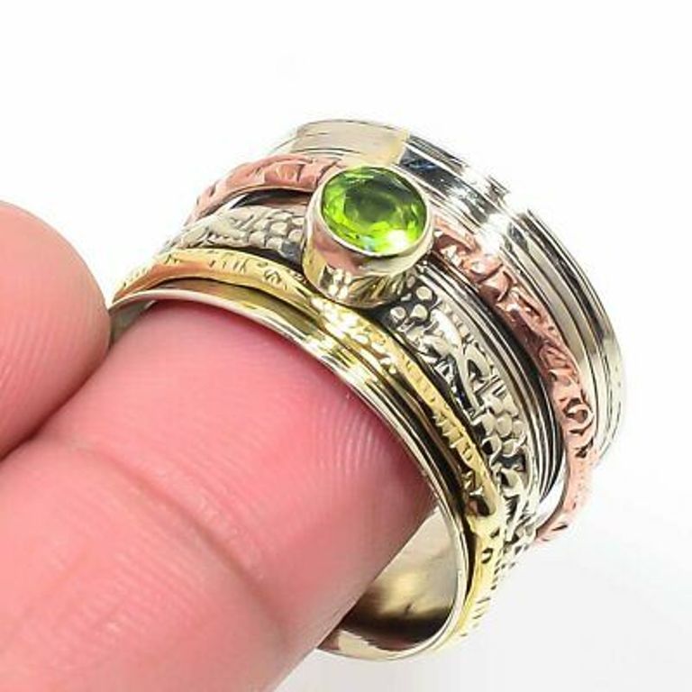 Δαχτυλίδι Spinner Rings, χειροποίητο, κατασκευασμένο από ασήμι 925, διακοσμημένο με φυσικό,ορυκτό, ημιπολύτιμο λίθο Περιδοτίτη (peridot). Mε επιμετάλλωση στα τρία χρώματα του χρυσού κίτρινου ροζ και λευκό.