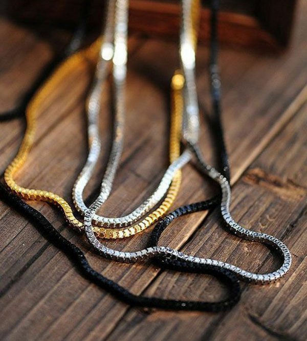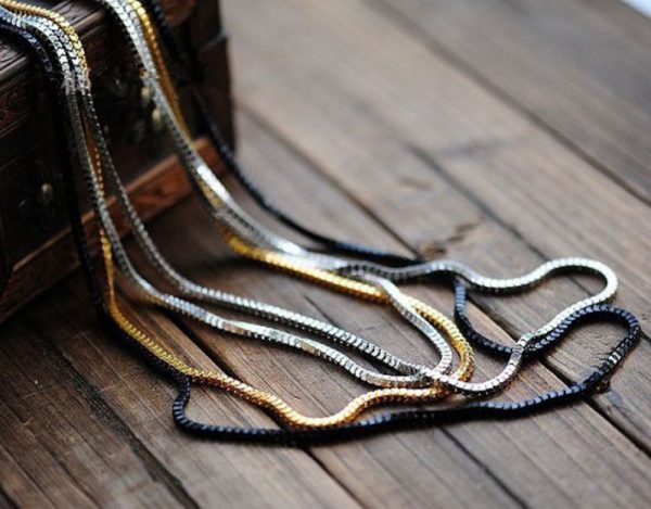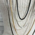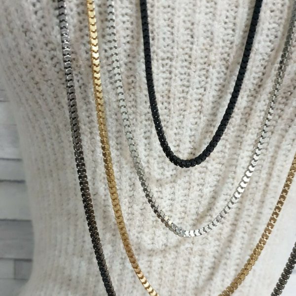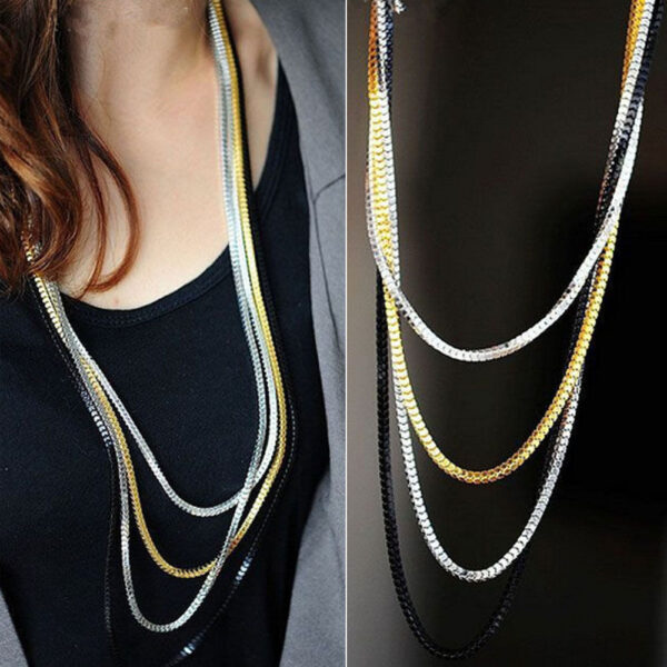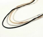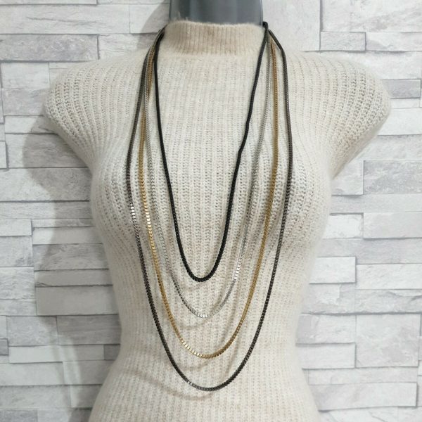 Το must του φετινού χειμώνα που θα φορεθεί πολύ! Μακρύ κολιέ που αποτελείται από τέσσερις αλυσίδες σε 4 διαφορετικά χρώματα Silver, gold, black και Silver dark. (Όχι ενωμένες μεταξύ τους). Μήκος 78cm,84cm,90cm,94cm. Κατασκευασμένο από German silver.