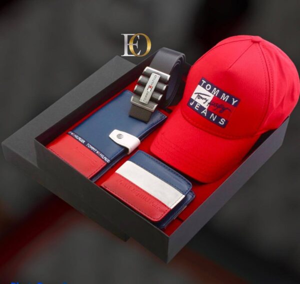 Ανδρικό ολοκληρωμένο σετ για δυναμικές εμφανίσεις. Το σετ περιλαμβάνει μεγάλο πορτοφόλι organizer καρτών, πορτοφόλι τσέπης, ζώνη και καπέλο TOMY HILFINGER. Έρχεται σε σας σε πολυτελή κασετίνα δώρου.