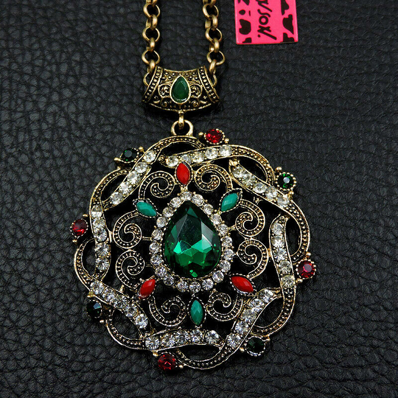 Πολύ ιδιαίτερο κόσμημα, κατασκευασμένο από χαλκό με αντικέ επεξεργασία, μεγάλο μοτίφ 6x6cm, το οποίο συνοδεύεται από την ανάλογη αλυσίδα 70 εκατοστών. Εντυπωσιάζει με τη λάμψη του και την καθαρότητα του το κεντρικό πράσινο κρύσταλλο σε κοπή pear.