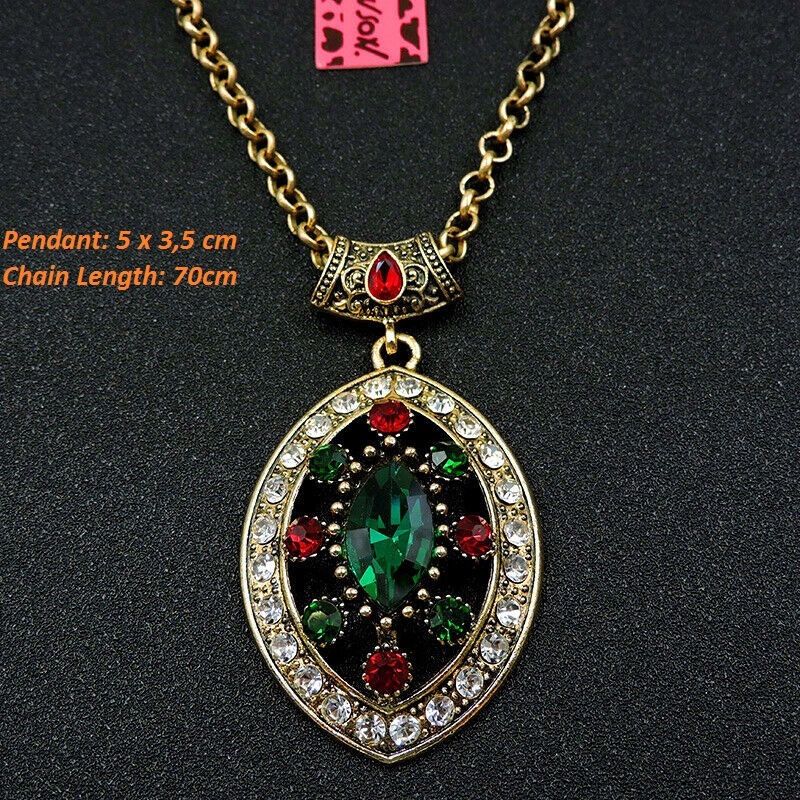Πολύ ιδιαίτερο κόσμημα, κατασκευασμένο από χαλκό με αντικέ επεξεργασία, μοτίφ 5×3,5cm, το οποίο συνοδεύεται από την ανάλογη αλυσίδα 70 εκατοστών. Φορέστε το χειροποίητο κολιέ με το χρώμα του βαθύ πράσινο κρύσταλλο σε κοπή oval και χαρίστε αέρα κομψότητας στην εμφάνισή σας.