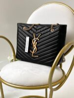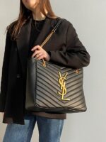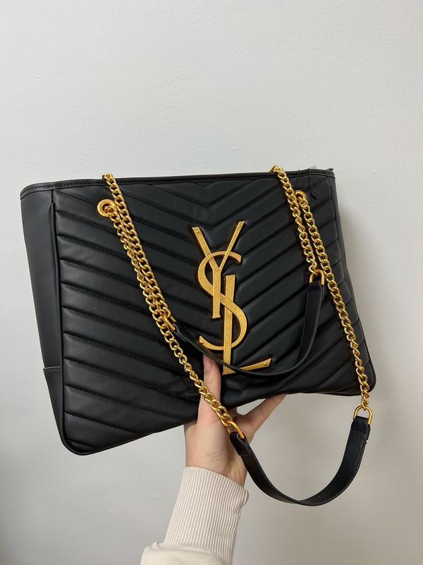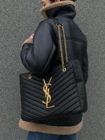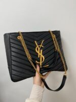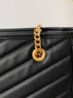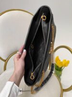 New collection από μαύρο δέρμα. Tα μεταλλικά της στοιχεία από υλικό σε χρυσό τόνο. Διαθέτει δύο ιμάντες ώμου σε χρυσό τόνο που σας διευκολύνει να τη μεταφέρετε στον ώμο σας ή στην κάμψη του χεριού σας. Δύο κύριες θήκες με μία τσέπη με φερμουάρ. Συνοδεύεται από υφασμάτινη τσάντα σκόνης. Διαστάσεις – 35×26x11cm.