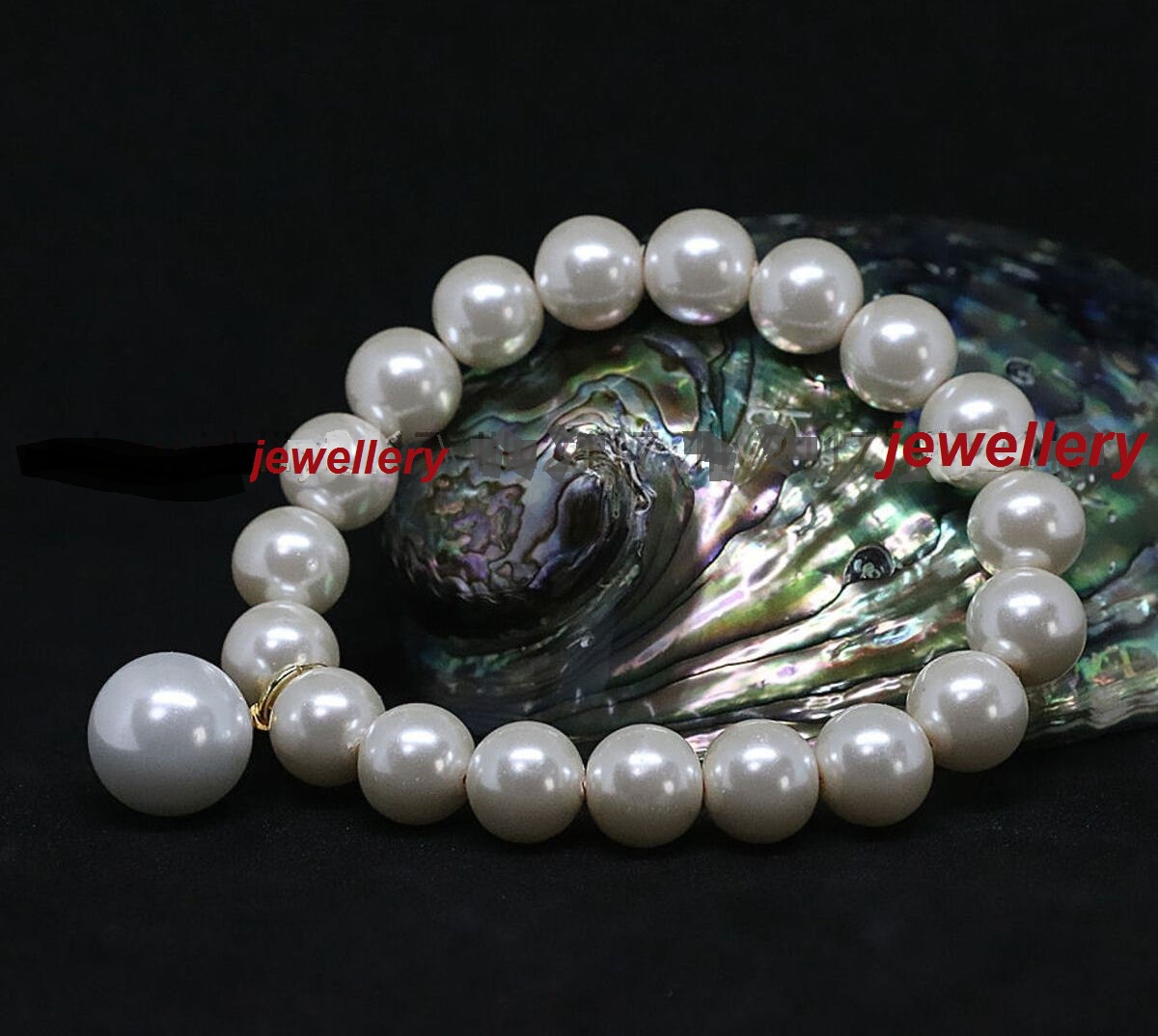 Γυναικείο βραχιόλι με λευκές Sea Shell πέρλες ΑΑΑ++ 10mm περασμένες σε διπλό ελαστικό νήμα δεμένες μία-μία. Κλέβει την παράσταση η μεγαλύτερη πέρλα 16mm δεμένη με επίχρυσο κρίκο 14k. Το βραχιόλι είναι άριστης ποιότητας, κατασκευασμένο από υψηλής ποιότητας υλικά, Κατασκευασμένο Σύμφωνα με τις Ευρωπαϊκές προδιαγραφές. Έρχεται σε σας σε πολυτελή συσκευασία δώρου