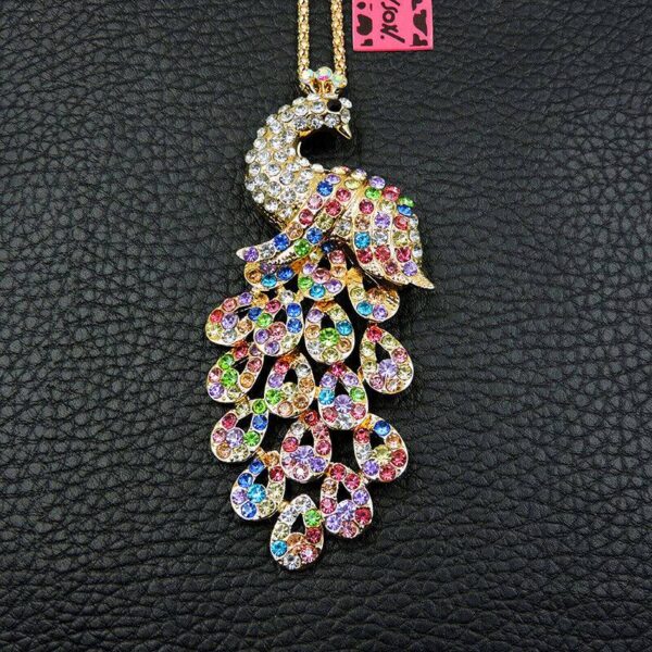 Το τυχερό παγόνι!!! Κατασκευασμένο από ασήμι και χαλκό με αντικέ επεξεργασία. Μεγάλο μοτίφ 10×4 εκατοστά. Συνοδεύεται από την ανάλογη αλυσίδα 70 εκατοστών. Σχεδιασμένο από την Betsey Johnson και διακοσμημένο με πολύχρωμα κρύσταλλα σε κοπή round και λευκά ζιργκόν επίσης σε κοπή round. Φορέστε το χειροποίητο κολιέ και χαρίστε αέρα κομψότητας στην εμφάνισή σας.