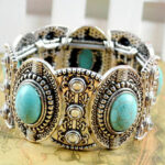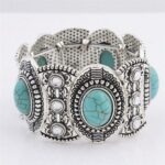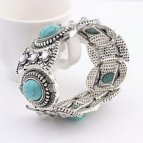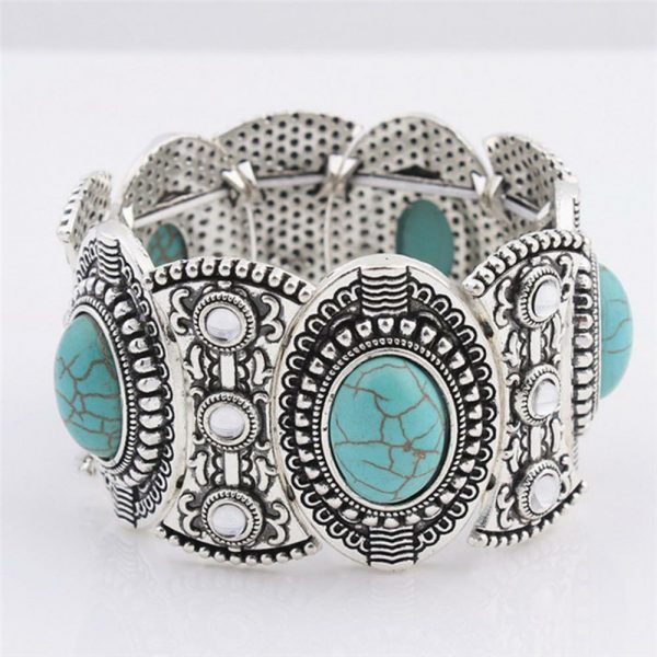 Υπέροχο μεγάλο βραχιόλι Boho Style!! Κατασκευασμένο από Tibetan silver και διακοσμημένο με πανέμορφα τυρκουάζ σε κοπή oval. Το βραχιόλι διαθέτει διπλό ελαστικό ιμάντα έτσι ώστε να προσαρμόζεται ακριβώς σε όλους τους καρπούς.